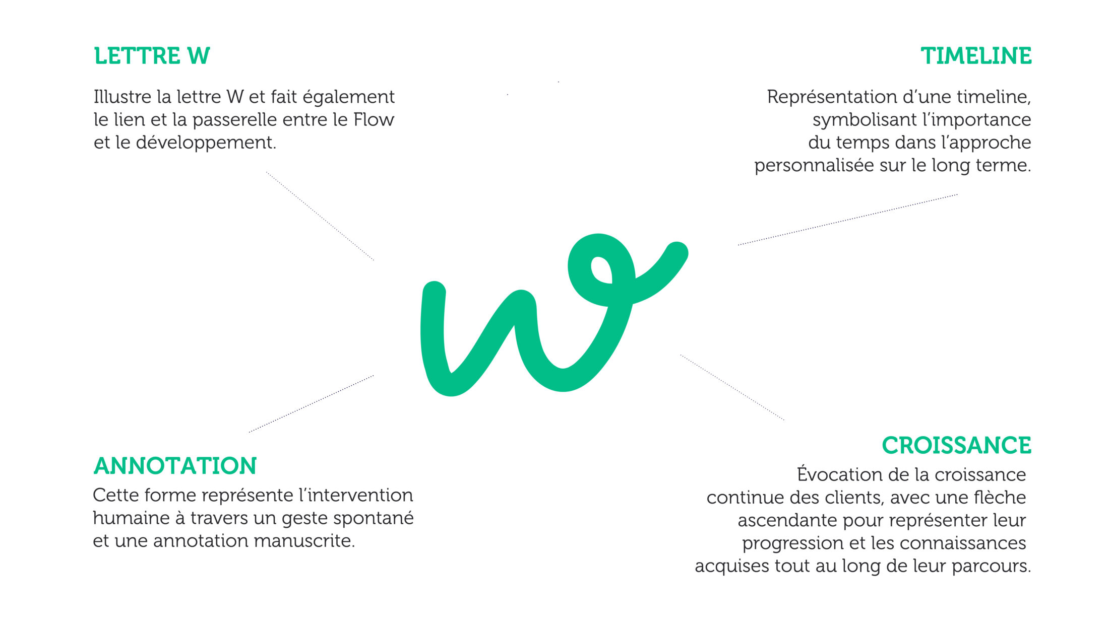 Plusieurs significations se cachent derrière ce logo : D’abord, la forme de la lettre « W » rappelle une timeline, soulignant l’importance du temps dans l’approche personnalisée que FlowDev propose. Elle met en avant le parcours individuel, marqué par des étapes claires et structurées. La flèche ascendante qui émerge de la lettre « W » symbolise l’évolution constante des compétences et des connaissances tout au long du parcours des participants.