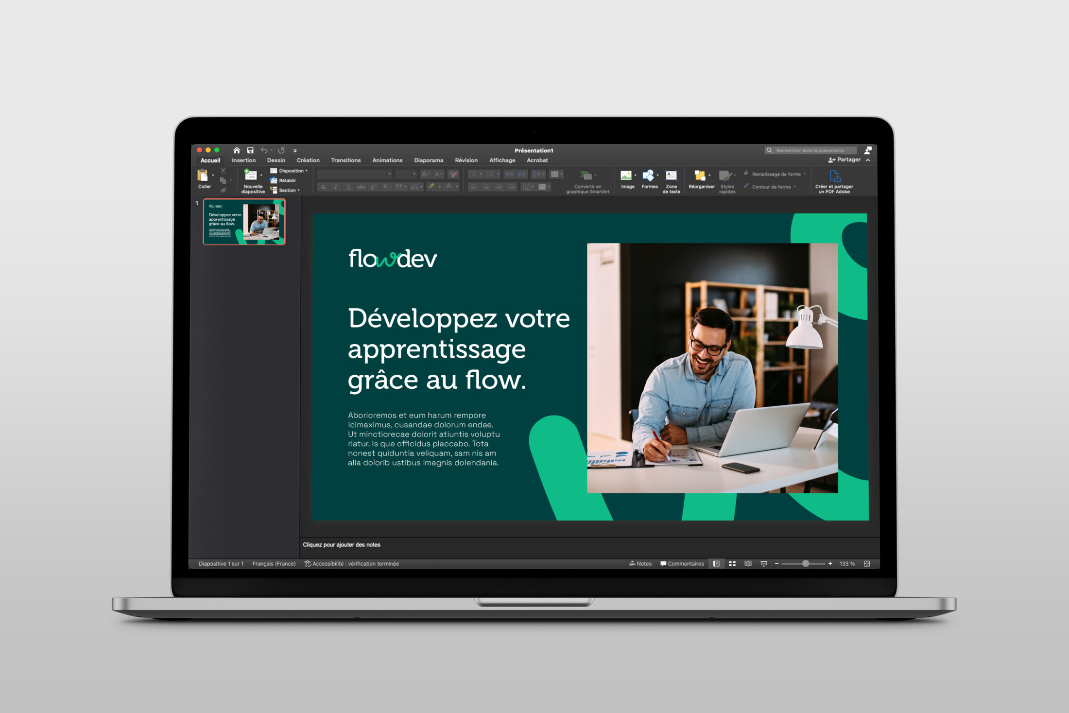 La charte graphique de FlowDev s’articule autour de la lettre « W » et se distingue par des couleurs dynamiques. Ces nuances sont soigneusement choisies pour inspirer à la fois la concentration et le calme. Elle habille habilement divers supports, qu’ils soient digitaux ou imprimés, reflétant ainsi notre engagement envers une communication visuelle cohérente, chaleureuse et contemporaine.