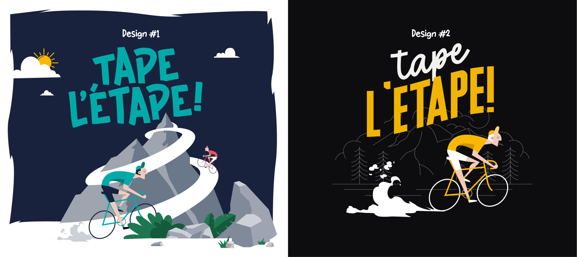 La piste retenue (#1) s’éloigne délibérément des codes graphiques du célèbre Tour de France pour se positionner plutôt dans les moments partagés et les souvenirs créés autour du vélo. Les couleurs jouent un rôle clé dans cette approche : des teintes vives et joyeuses prédominent, évoquant l’excitation des escapades à vélo, les sourires partagés et la découverte de paysages variés.